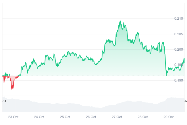 According to CoinMarketCap, DOGE is trading around $0.19, holding firm at a key support level. Notes accumulation is ongoing, and technical indicators suggest a breakout is possible. Triangle patterns and cycle VWAP signals highlight equilibrium points.