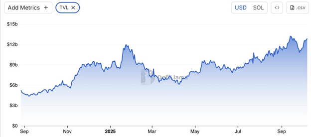 Fresh on-chain snapshots show Solana TVL hovering around recent peaks, with DefiLlama listing the figure in the $11–12 billion band this week. The TVL recently hit a three-year high, which signals deeper native commitment and a stronger buffer for liquidity providers.