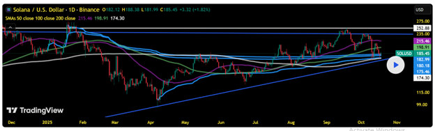 Short-term traders are watching clear bands on Solana. Analysts put support near $170 and resistance around $190–$200, with momentum improving daily. If price holds above that area, models open targets around $220–$230, with stretch cases mapped higher if ETF flows stay steady.